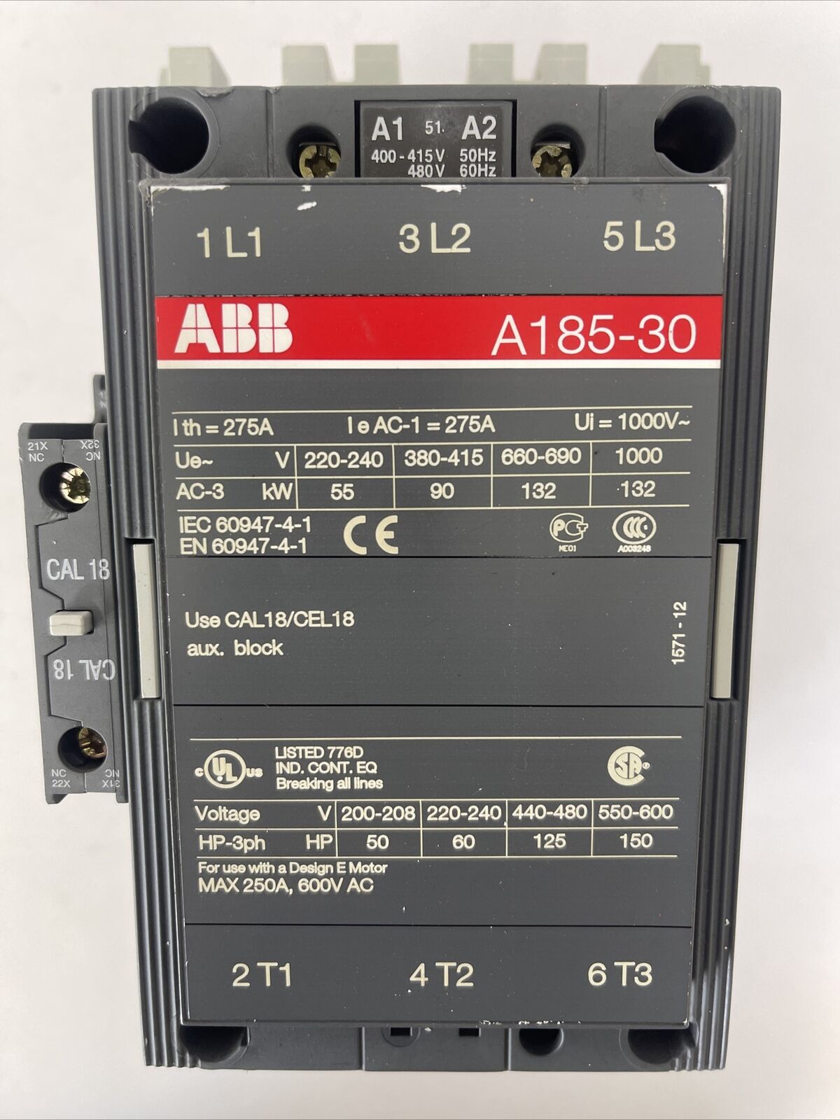 ABB A185-30 CONTACTOR 600VAC 150HP 3PH 250A COIL 400-415V 50HZ 480V 60HZ