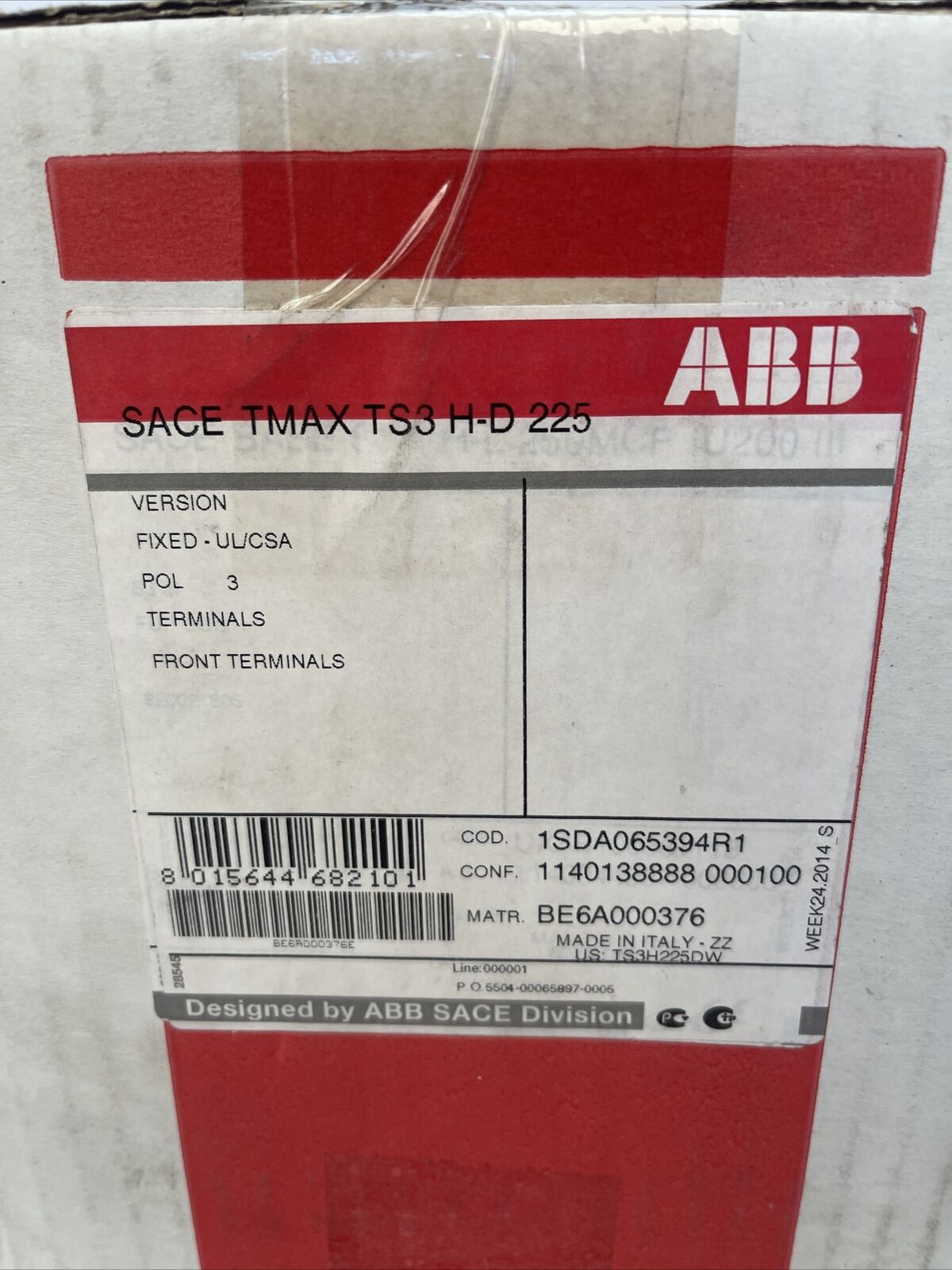 ABB SACE TMAX TS3H-D 225 CIRCUIT BREAKER 225AMP 480VAC 500VDC 3POLE