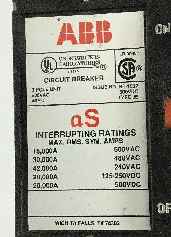 ABB UXAB 718530 R 999 300AMP CIRCUIT BREAKER TYPE JS 500VDC/480VAC