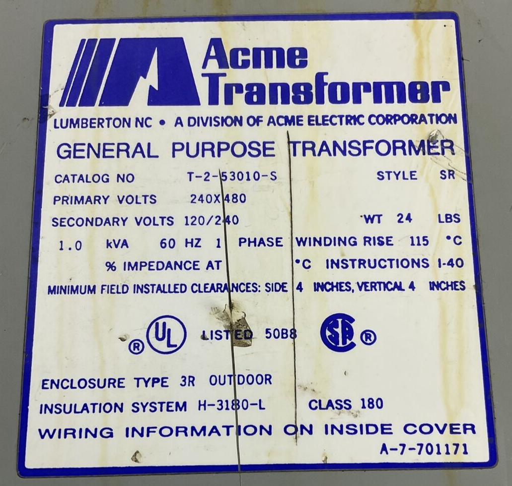 ACME T-2-53010-S TRANSFORMER 1PH 1KVA 60HZ 480VAC OUTDOOR 3R STYLE SR