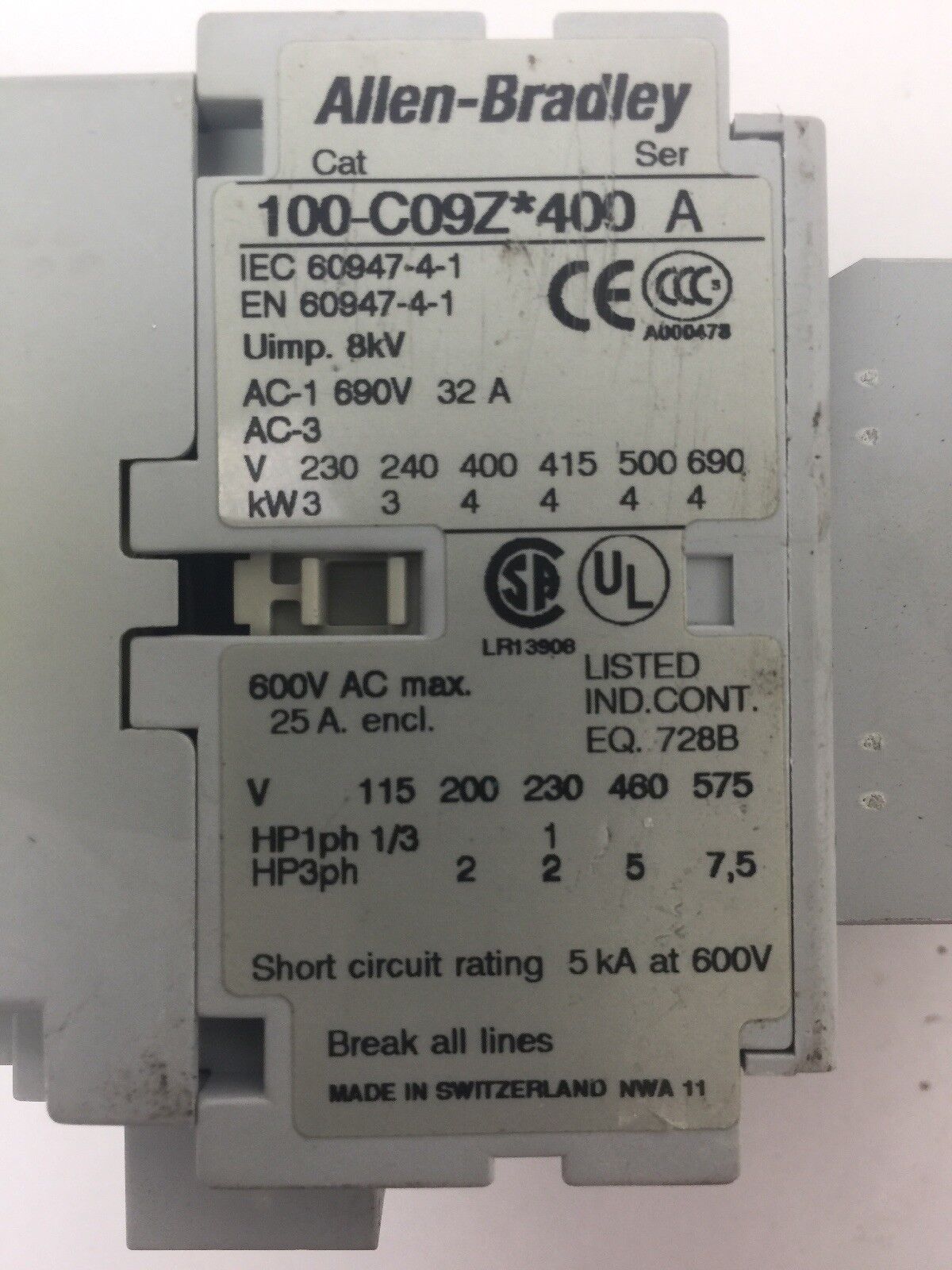 ALLEN BRADLEY 100-C09Z*400 CONTACTOR WITH 100-F COIL 24VDC