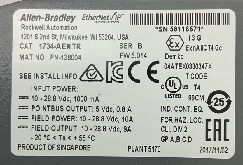 ALLEN BRADLEY 1734-AENTR SER B FW 5.014 COMMUNICATIONS ADAPTER MODULE 10-28.8VDC