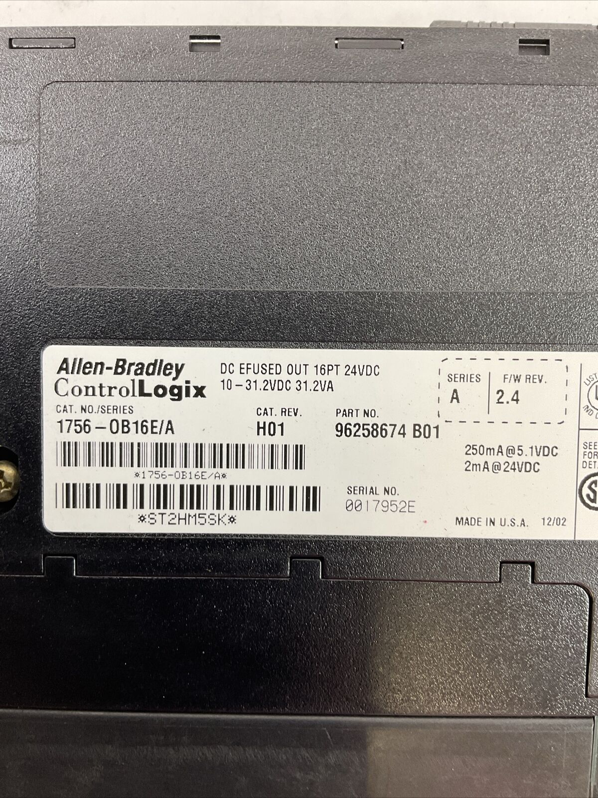 ALLEN BRADLEY 1756-OB16E SER A CAT REV H01 F/W REV 2.4 DC EFUSED OUT 16PT 24VDC 10-31.2VDC 31.2VA