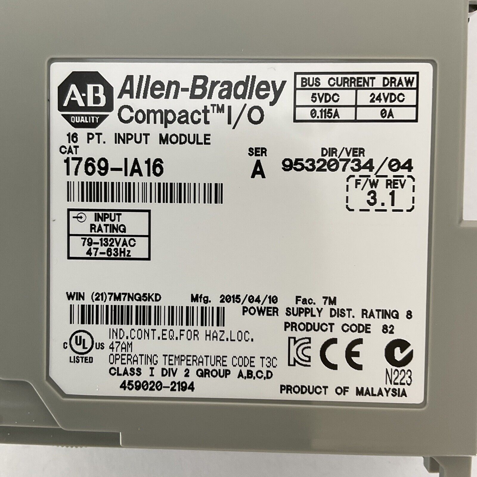 ALLEN BRADLEY 1769-IA16 DIR/VER 95320734/04 F/W REV 3.1 SER A 16PT INPUT MODULE