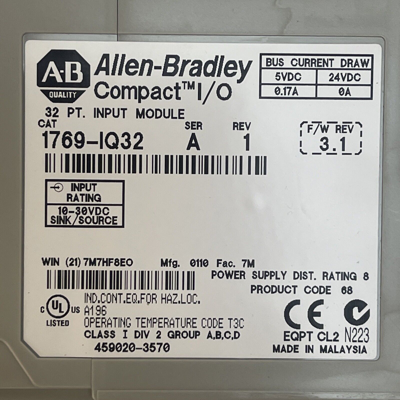 ALLEN BRADLEY 1769-IQ32 COMPACT I/O 32 PT INPUT MODULE SER A REV 1 F/W REV 3.1