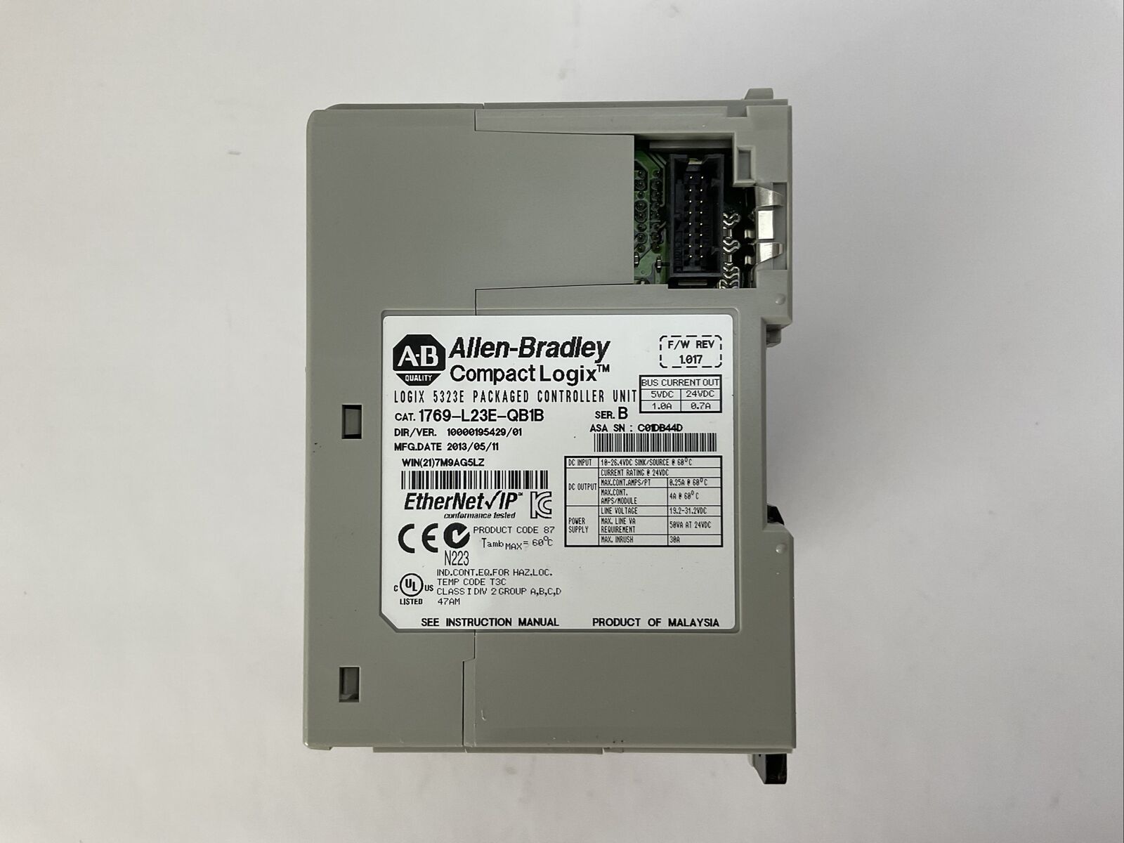 ALLEN BRADLEY 1769-L23E-QB1B SER B F/W REV 1.017 COMPACT LOGIX 5323E PACKAGED CONTROLLER UNIT