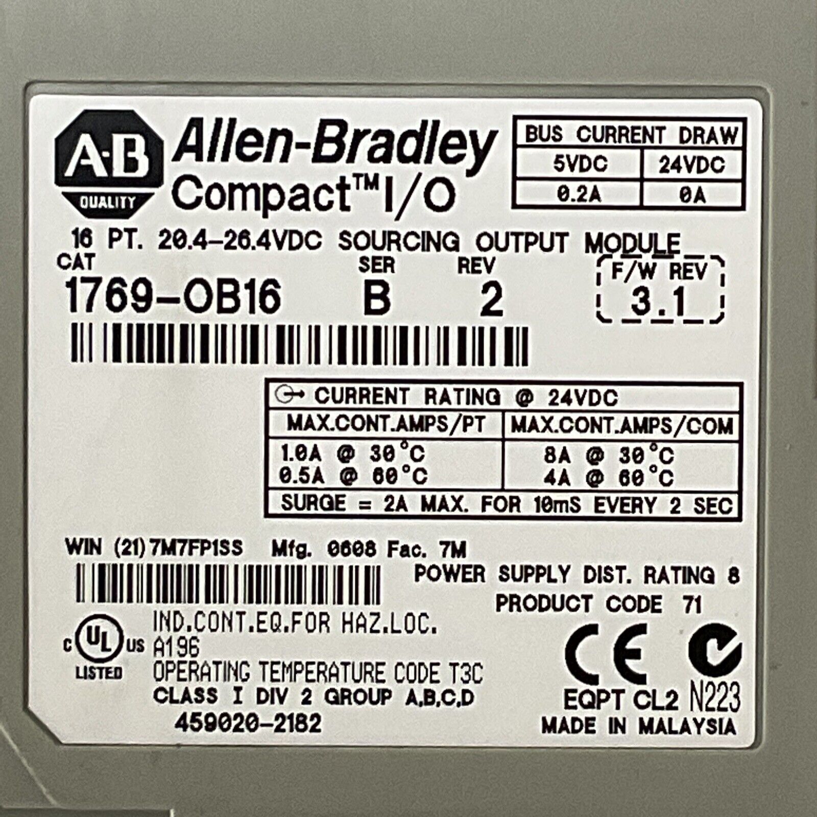 ALLEN BRADLEY 1769-OB16 SER B REV 2 F/W REV 3.1 16PT 20.4-26.4VDC SOURCING OUTPUT MODULE COMPACT I/O