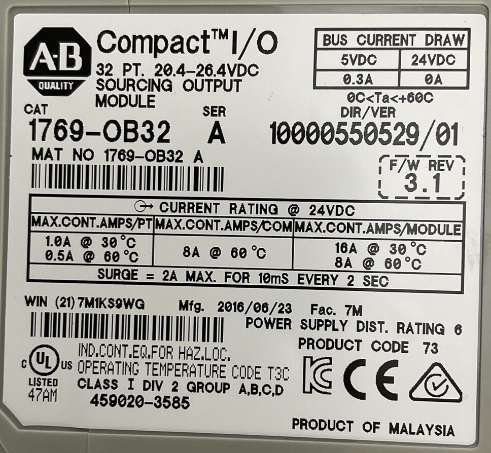 ALLEN BRADLEY 1769-OB32 SER A DIR/VER 10000550529/01 F/W REV 3.1 32PT COMPACT