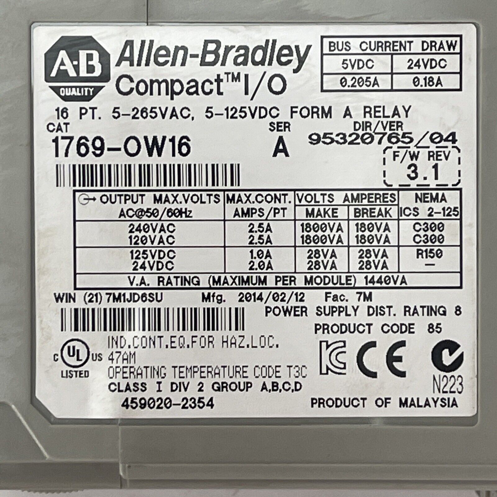ALLEN BRADLEY COMPACT I/O 1769-OW16 SER A F/W REV 3.1 16PT 5-265VAC 5-125VDC FORM A RELAY DIR/VER 95320765/04