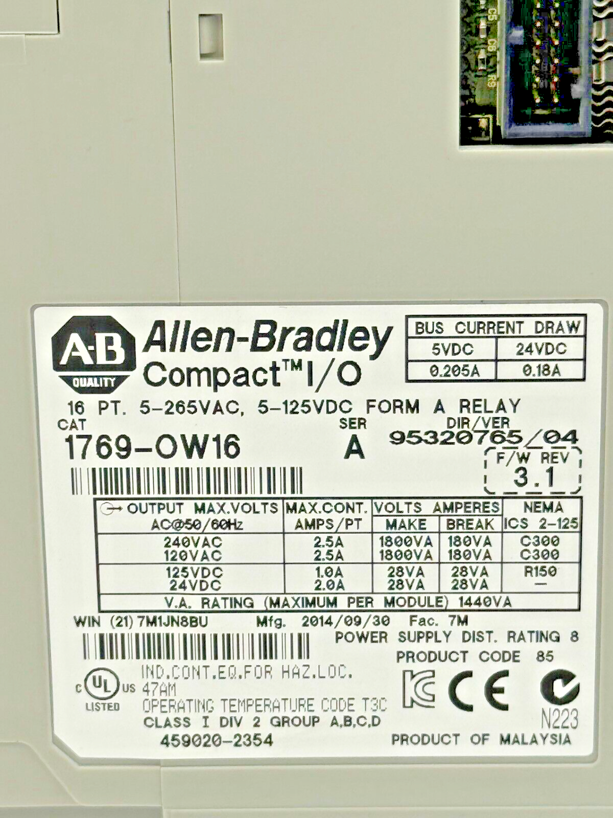 ALLEN-BRADLEY - 1769-OW16 SER A - F/W REV 3.1 DIR/VER 95320765/04 FORM A RELAY