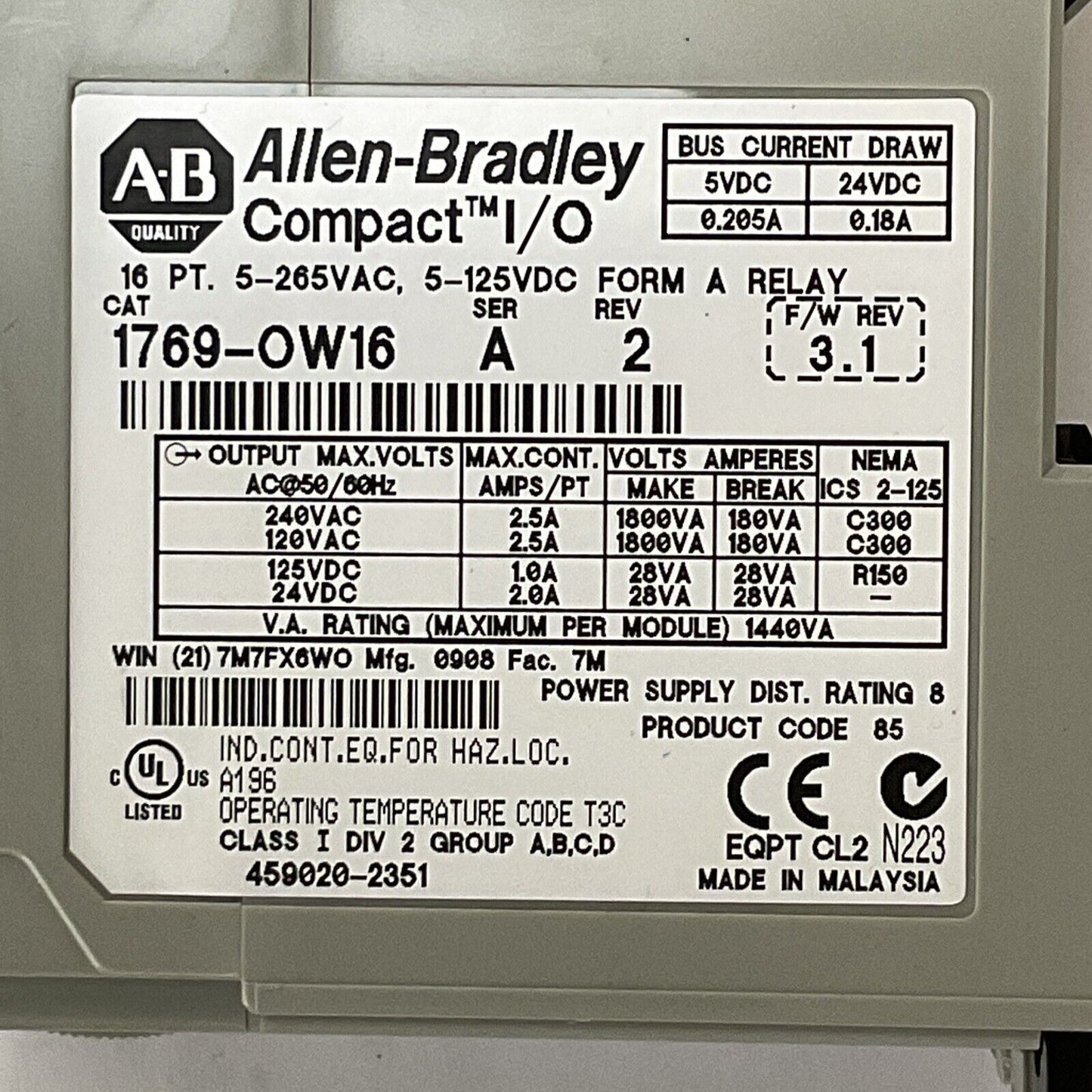 ALLEN BRADLEY 1769-OW16 SER A REV 2 F/W REV 3.1 16PT 5-265VAC 5-125VDC FORM A