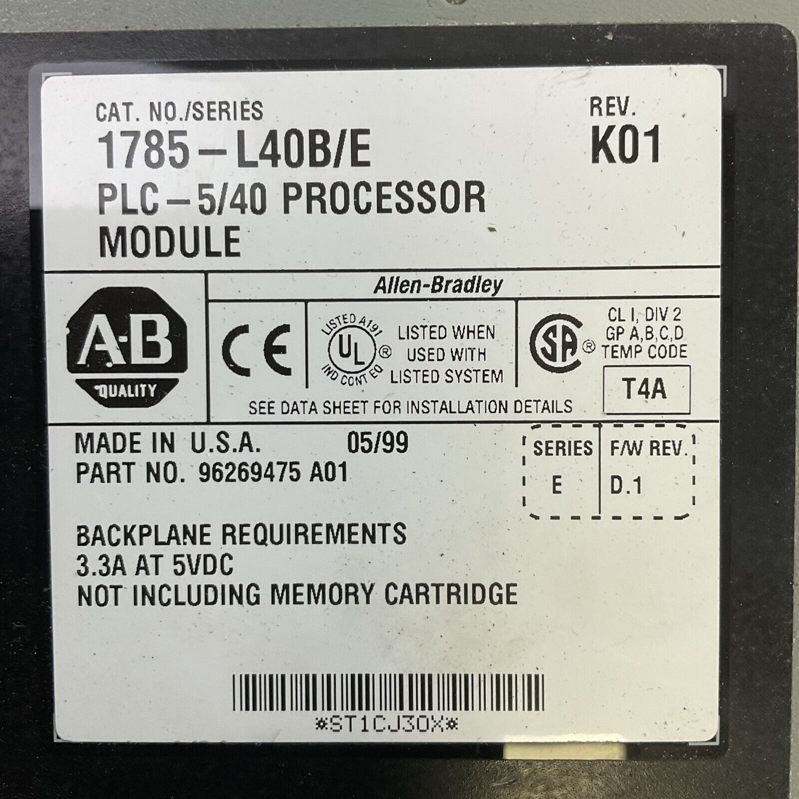 ALLEN BRADLEY 1785-L40B SER E REV K01 PLC 5/40 PROCESSOR MODULE F/W REV D.1 5VDC