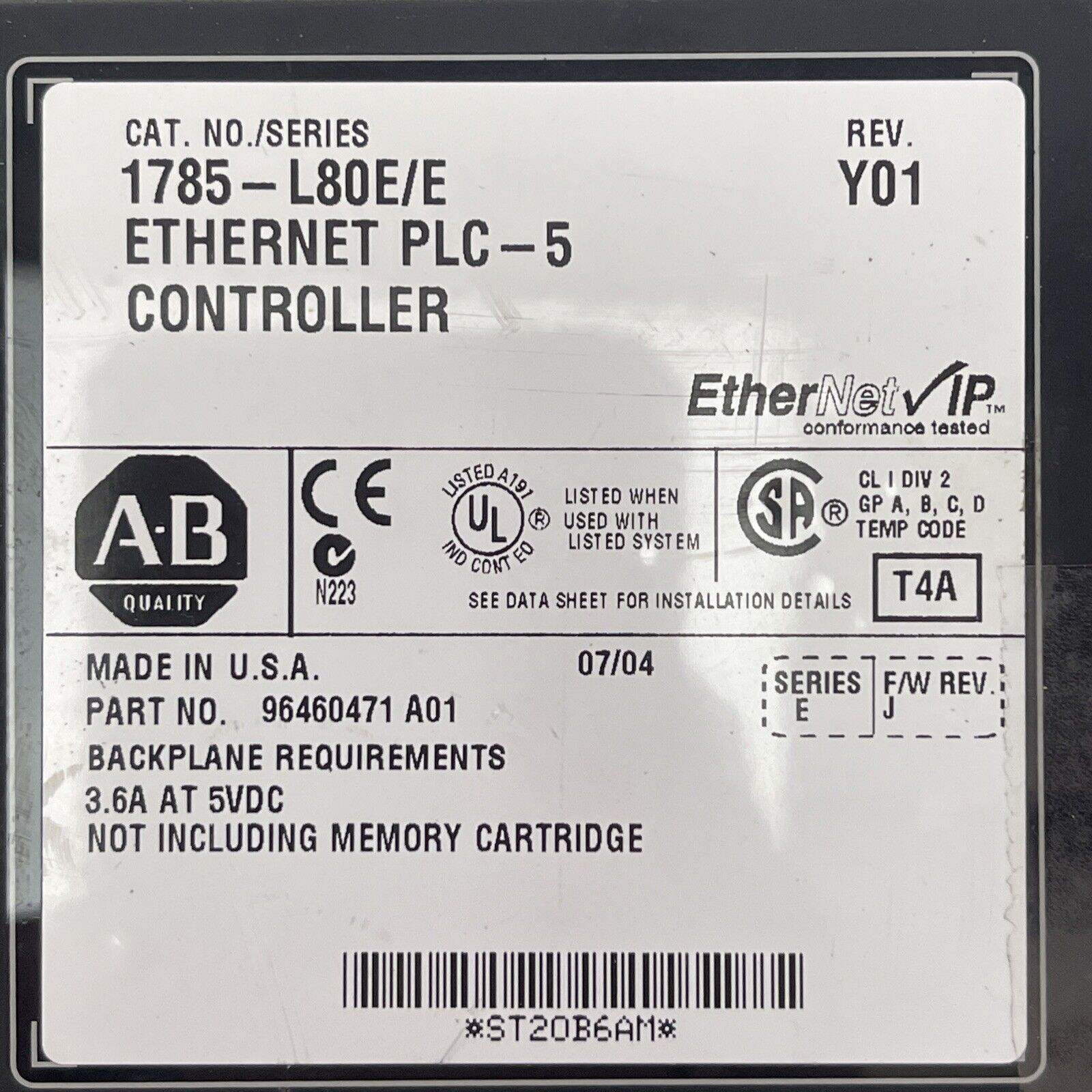 ALLEN BRADLEY 1785-L80E/E ETHERNET PLC-5 CONTROLLER REV Y01 SERIES E F/W REV J 3.6A AT 5VDC