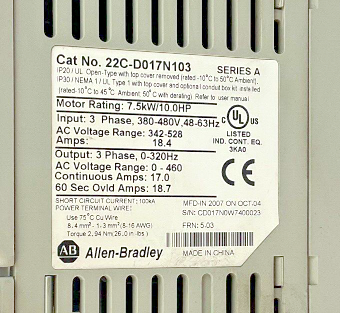 ALLEN-BRADLEY 22C-D017N103 DRIVE SER.A FRN:5.03 POWERLEX 400 7.5KW 10HP
