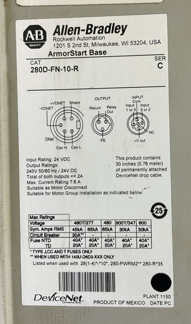 ALLEN BRADLEY 280D-FN-10-R SER C ARMORSTART BASE 280D-F12Z-10C-GRW-3-P1 CONTROL