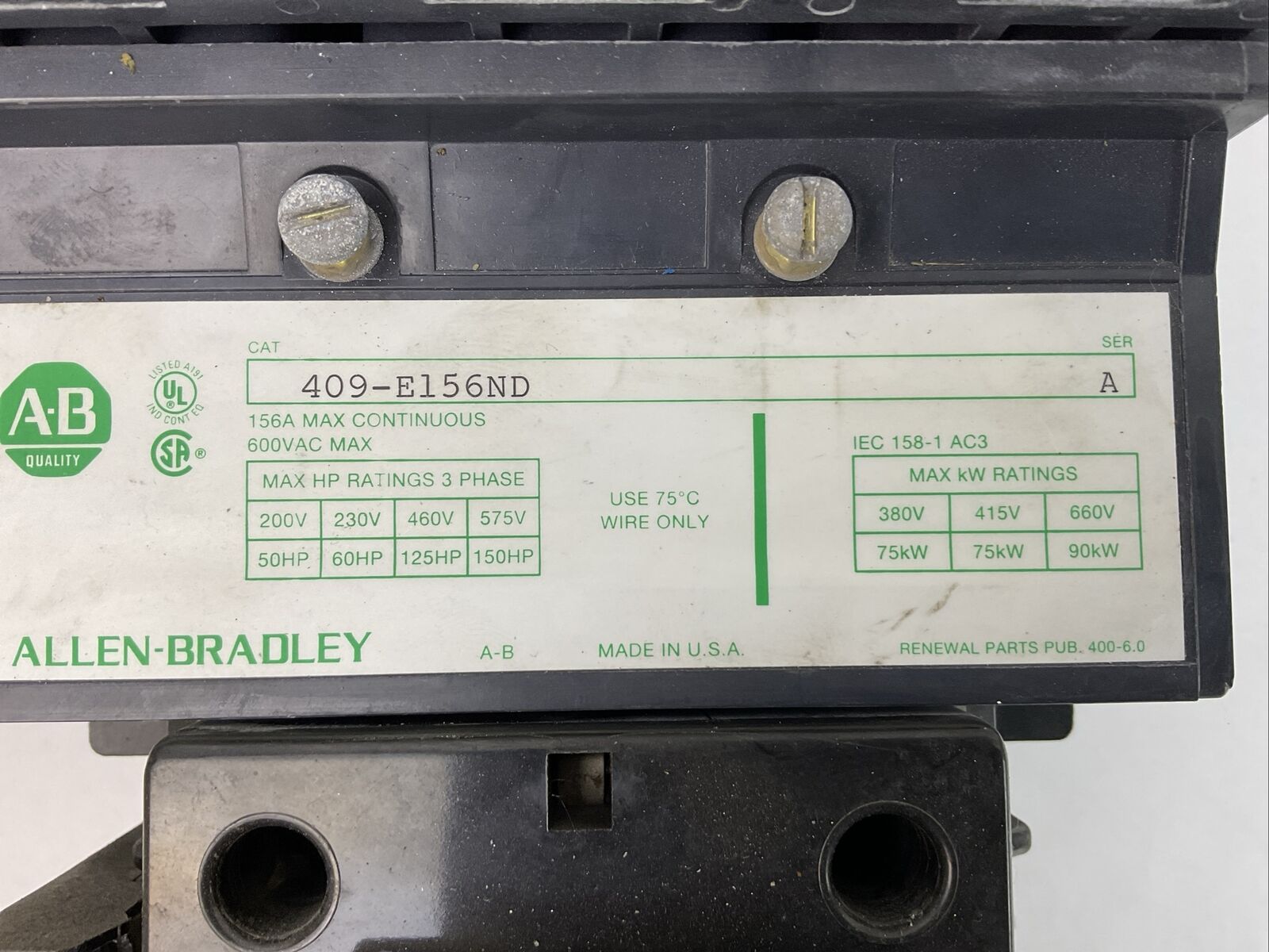ALLEN BRADLEY 409-E156ND STARTER 600VAC 156A SER A COIL 115-120V 60HZ