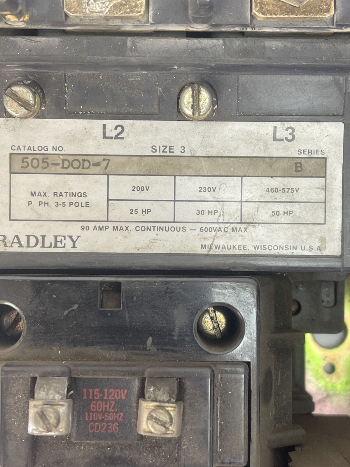 ALLEN BRADLEY 505-DOD-7 SIZE 3 REVERSING STARTER 90A 600VAC 50HP COIL 115-120V