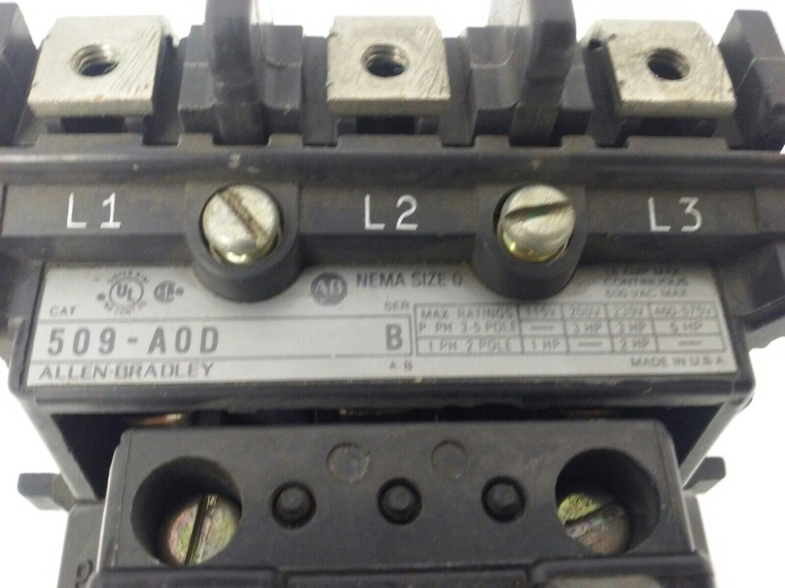 ALLEN BRADLEY 509-AOD, SERIES B, STARTER, SIZE 0, 600V, 18A, 5 H.P.,120V COIL, NO HEATERS, USED,