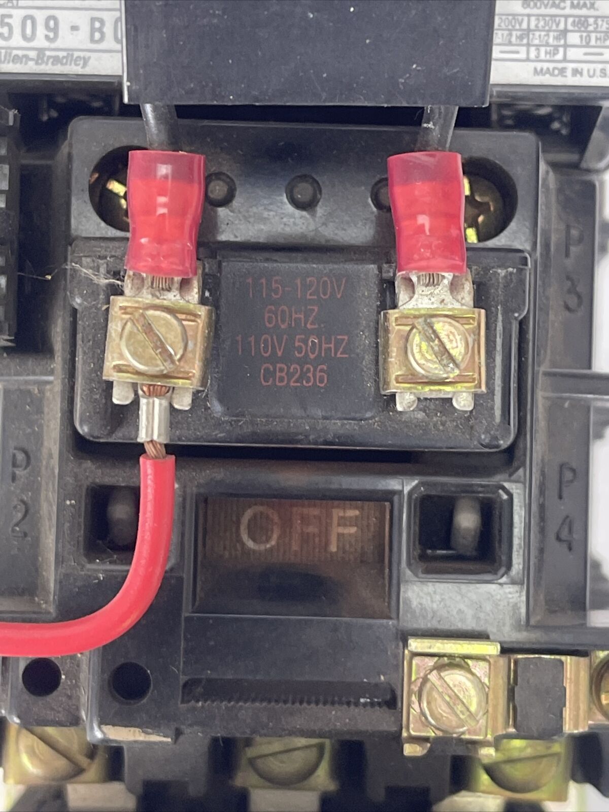 ALLEN BRADLEY 509-B0D-A2E STARTER 600VAC 27A 10HP SER B COIL 115-120V 592-A2EA