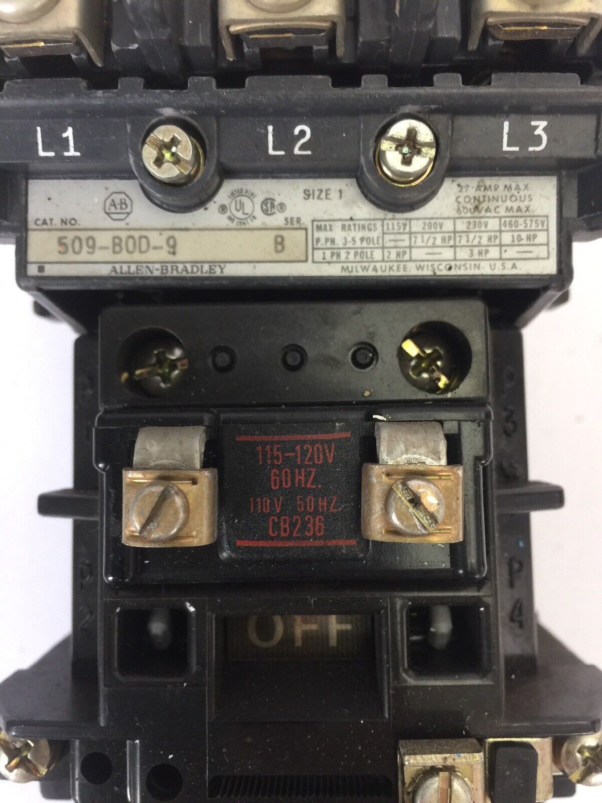 ALLEN BRADLEY 509-BOD-9 SIZE1 STARTER 600VAC 27AMP 10HP W40 HEATERS 120V COIL