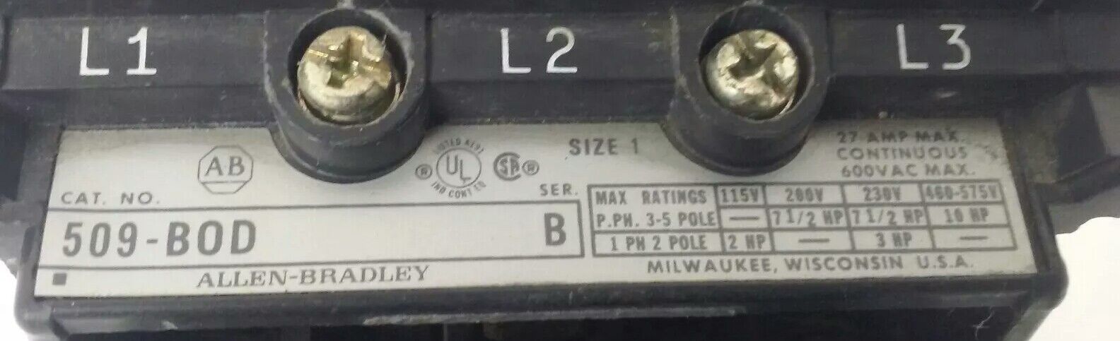 ALLEN BRADLEY 509-BOD SERIES B, SIZE 1, MOTOR STARTER, 27A, 600V, 3-5 POLE,