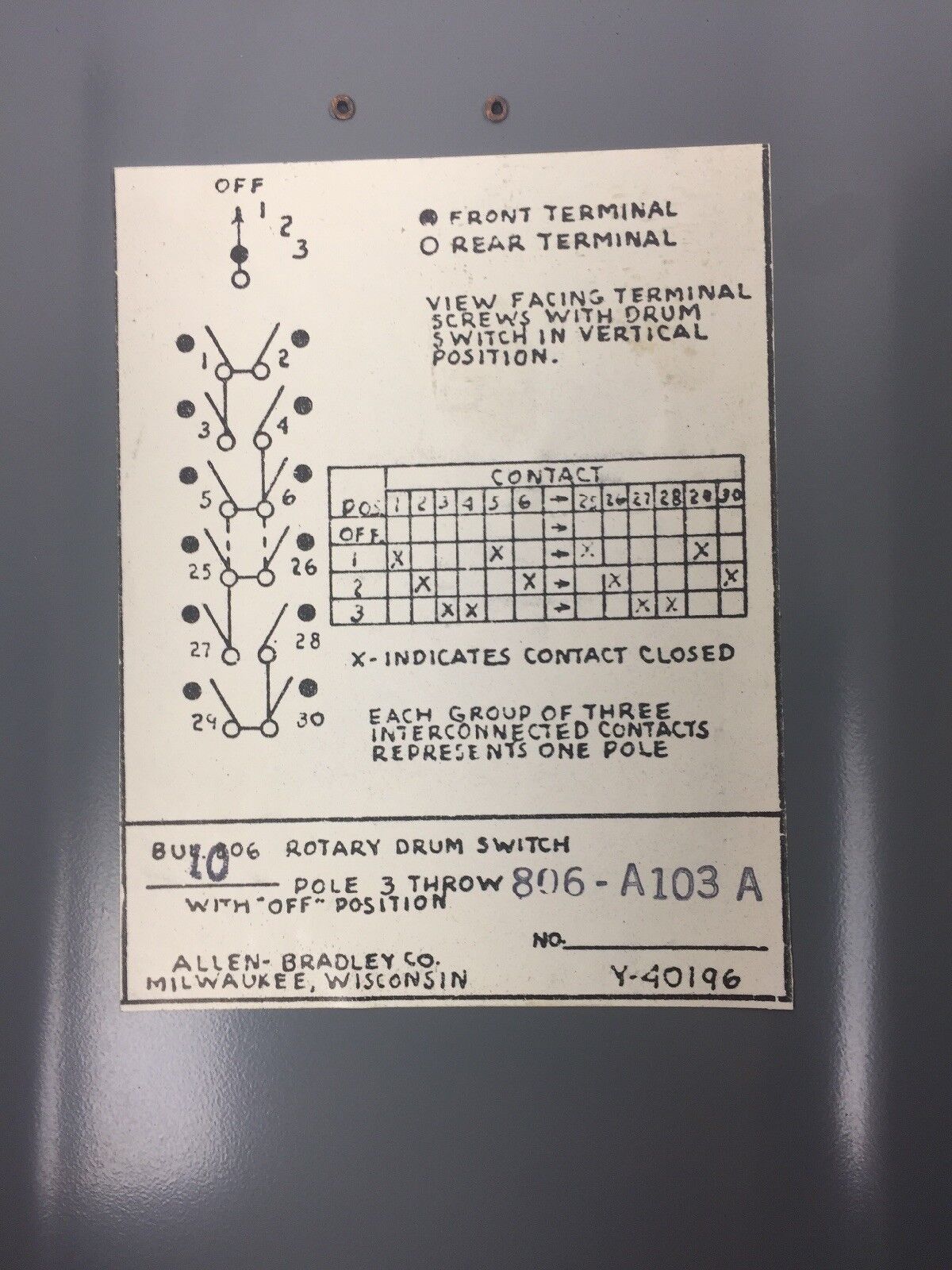 ALLEN BRADLEY 806-A103 ROTARY PILOT SWITCH 10 POLE 3 THROW WITH OFF POSITION