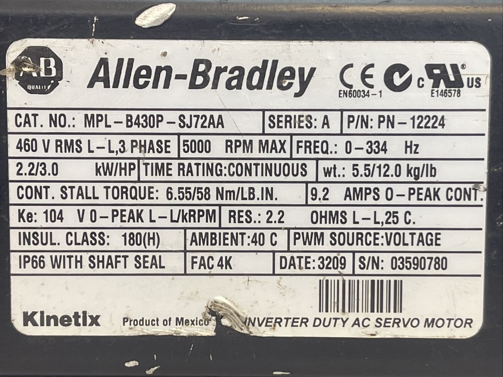 ALLEN BRADLEY MPL-B430P-SJ72AA SERVO MOTOR SER A 5000RPM 2.2/3.0 kW/HP 9.2AMP