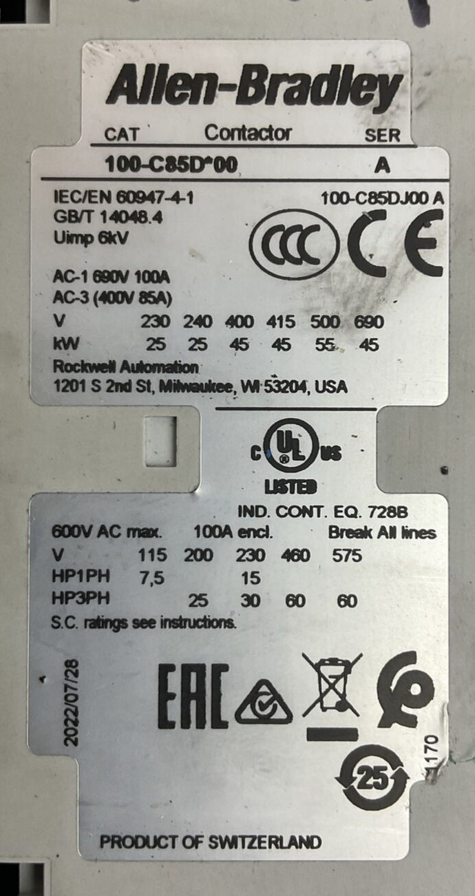 ALLEN BRADLEY STARTER (100-C85D*00 SER A CONTACTOR + 193-1EFGE RELAY + 100S)