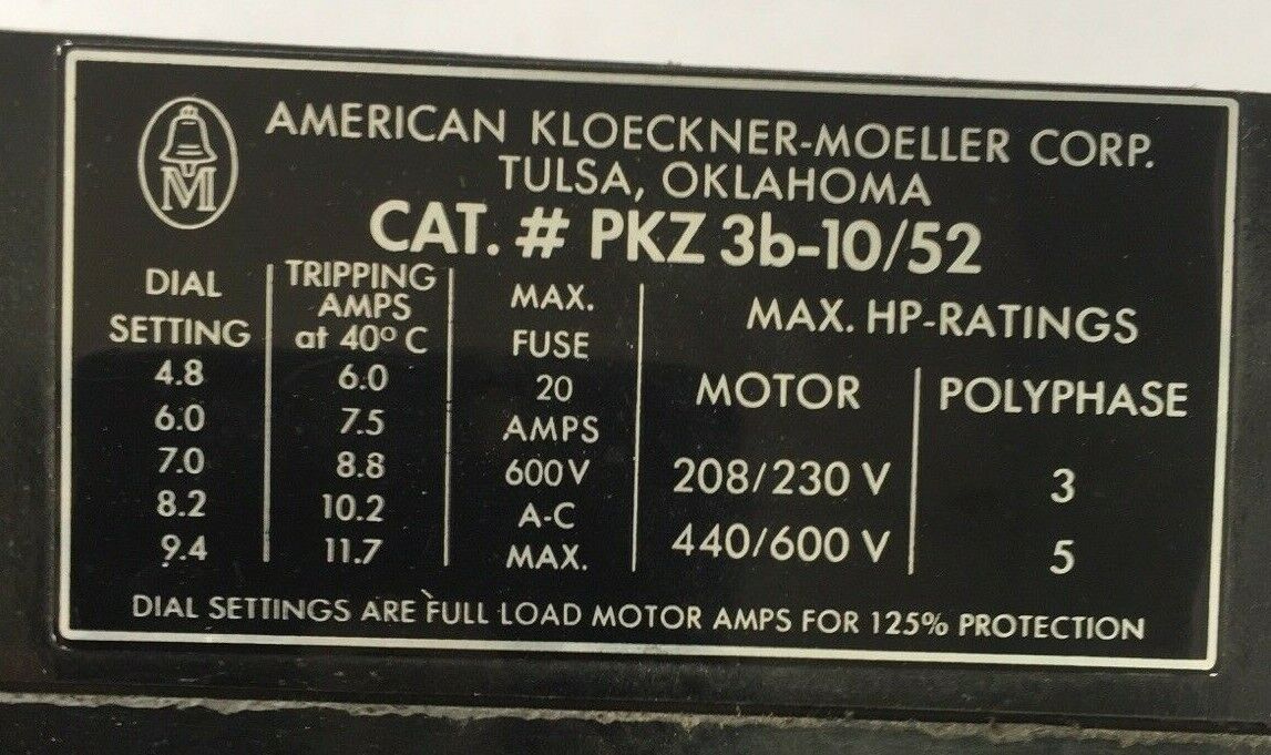 AMERICAN KLOECKNER-MOELLER PKZ 3B-10/52 START STOP PUSH BUTTON SWITCH 600VAC 20A