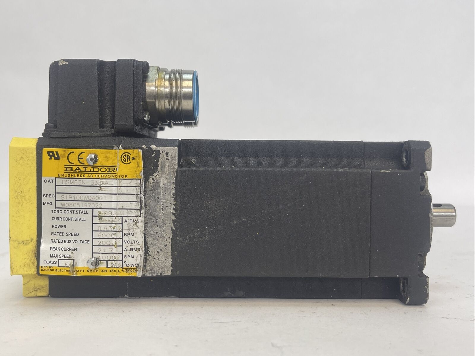BALDOR BSM63N-333AA BRUSHLESS AC SERVO MOTOR POWER 0.93KW RATED SPEED 6000RPM RATED BUS VOLTAGE 200V PEAK CURRENT 21.7 A RPM MAX SPEED 10000RPM