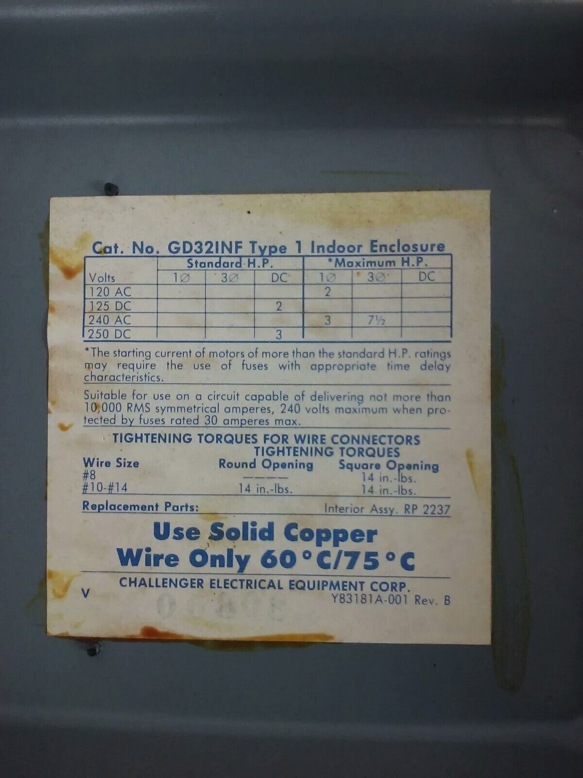 CHALLENGER GD321NF, 30A, 240V, 7 1/2 MAX H.P., TYPE 1 INDOOR, SAFETY SWITCH, NEW