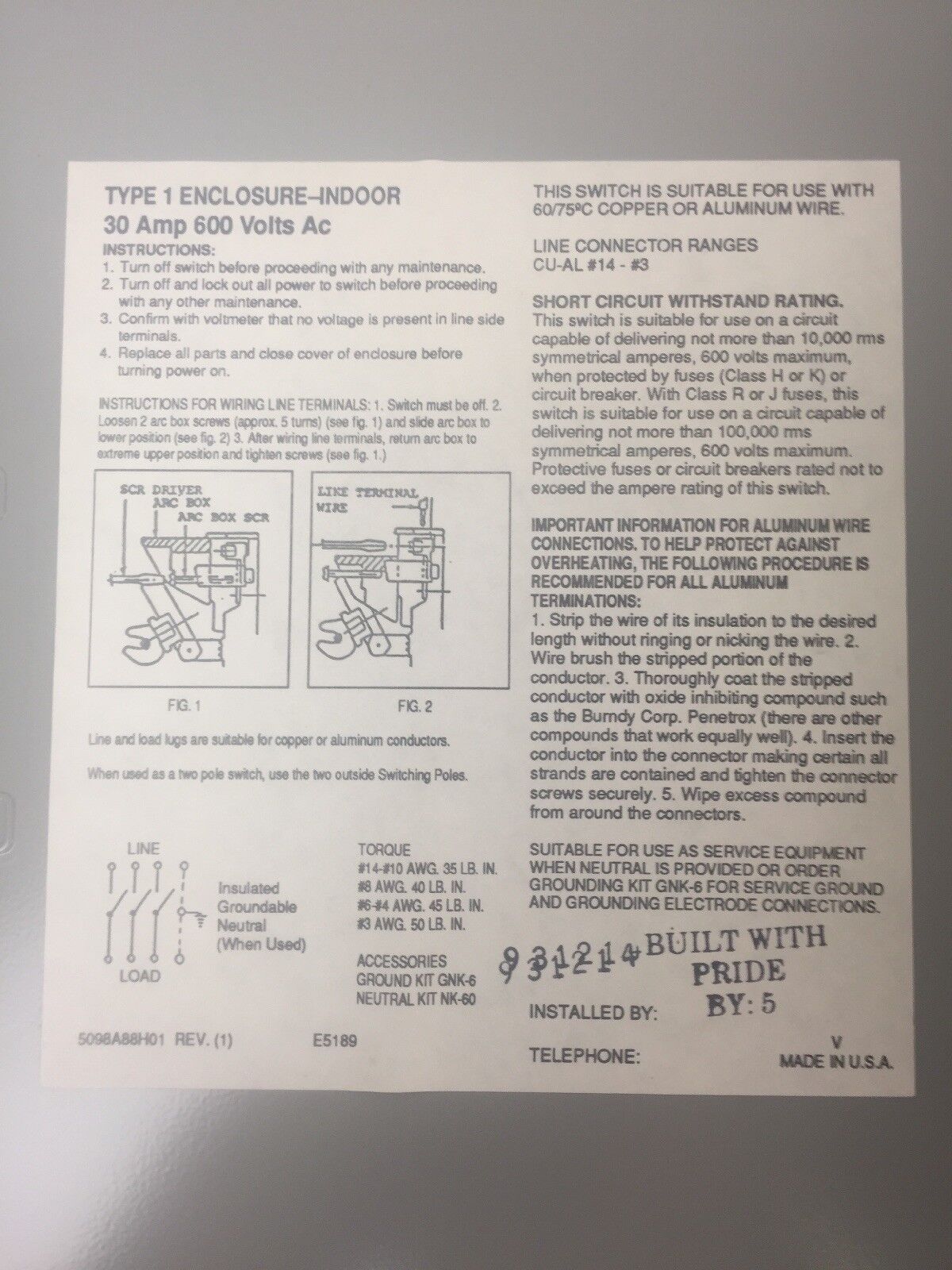 CHALLENGER HD361NFC HD SAFETY SWITCH 600V 30AMP 20HP 3 POLE NON FUSIBLE TYPE 1