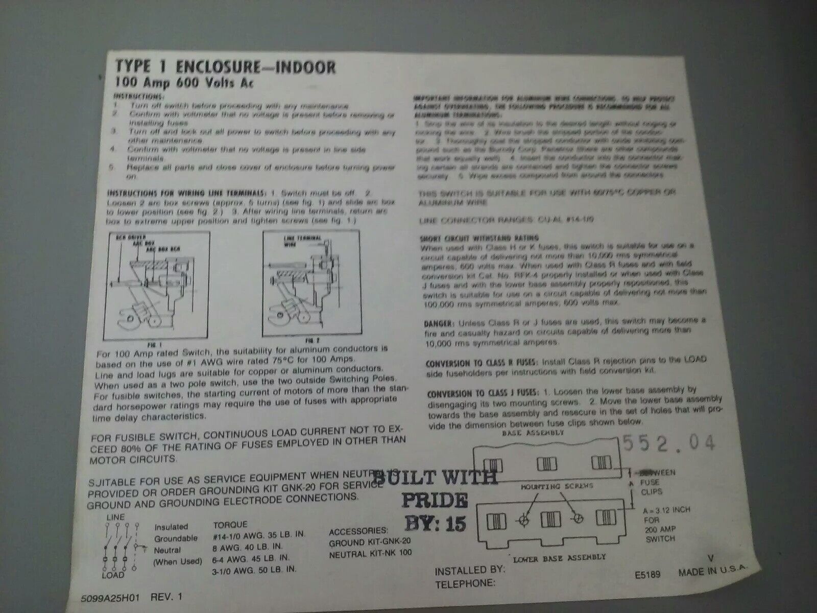 100A, 600V, 3PH, 75HP, TYPE 1 INDOOR ENCLOSURE