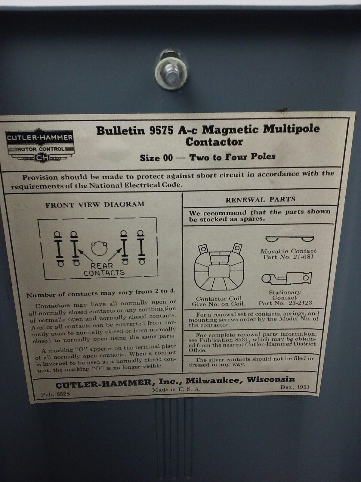 CUTLER HAMMER, 9575H2027, MAGNETIC A.C. RELAY, 440V, 60HZ, 2POLE, SIZE 00, NEMA 1, 2 N.O., 440V COIL, NEW