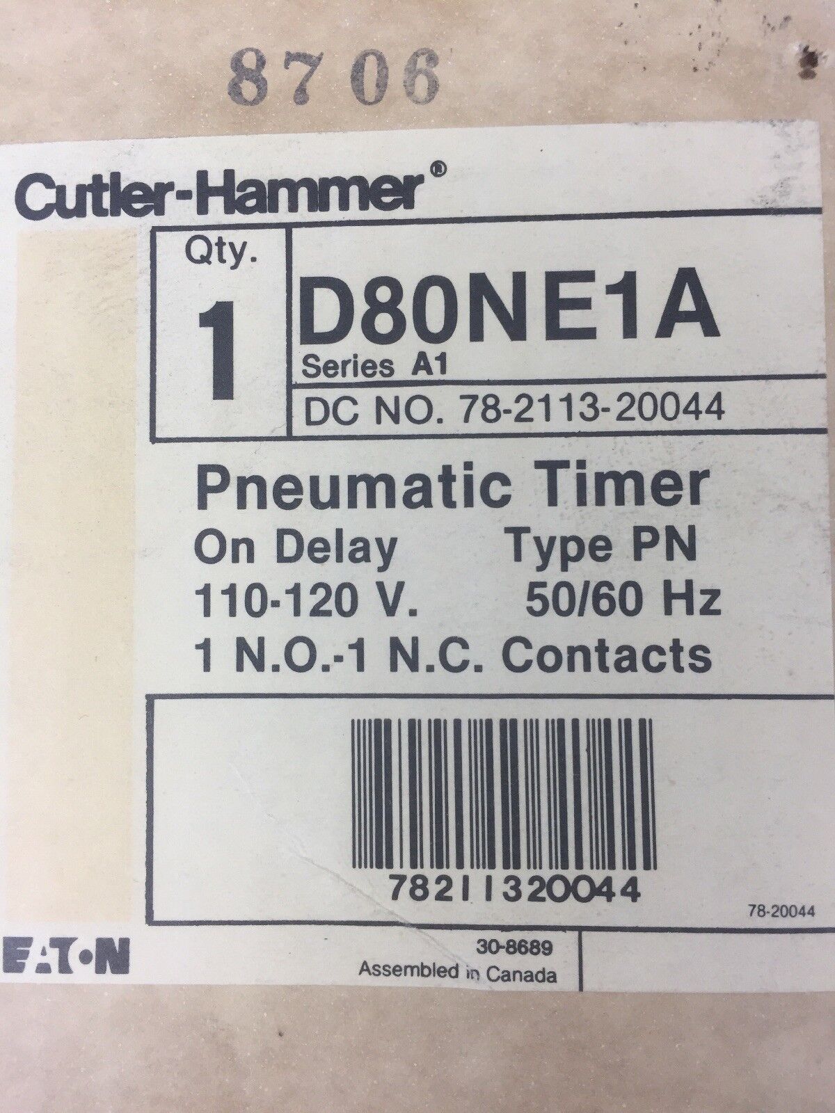 CUTLER HAMMER D80NE1A PNEUMATIC TIMER 110-120V 50/60HZ 1 N.O.-1 N.C. CONTACTS
