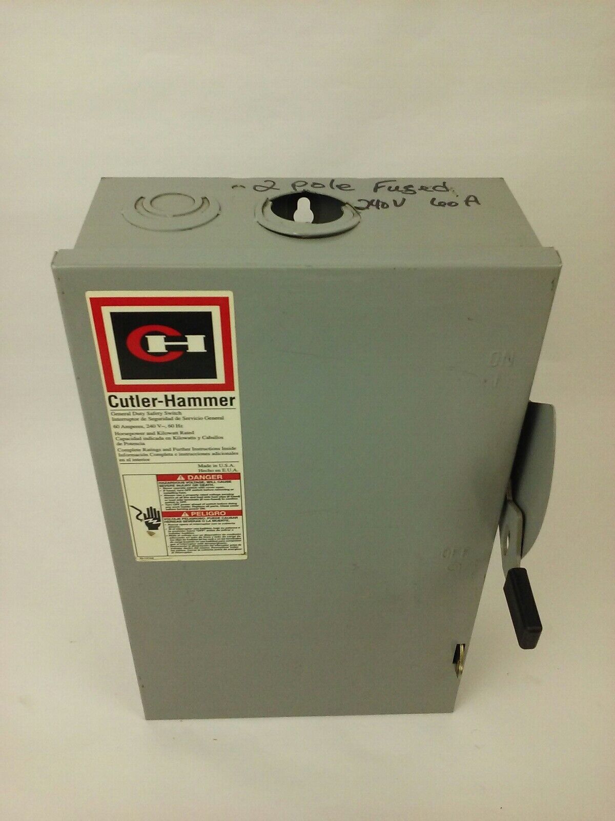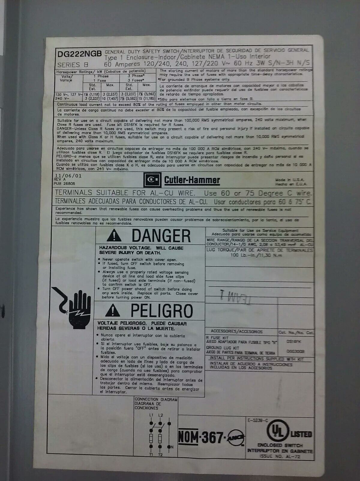CUTLER HAMMER DG222NGB, SERIES B, GENERAL DUTY SAFETY SWITCH, 60A, 240V, 60HZ, 2 POLE WITH NEUTRAL, FUSIBLE, TYPE 1 ENCLOSURE, NEMA 1, USED, HOLE PUNCHED OUT ON TOP OF SAFETY SWITCH!!!!