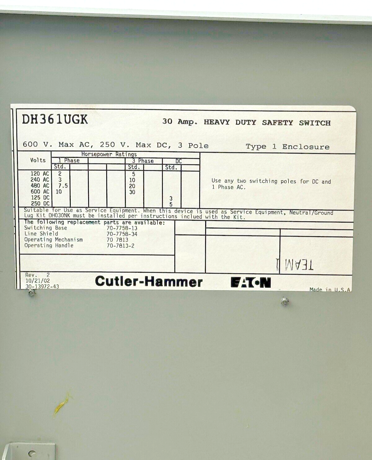 CUTLER-HAMMER - DH361UGK - HD SAFETY SWITCH - 30A/ 600VAC/250VDC/ 3 POLE/ TYPE 1