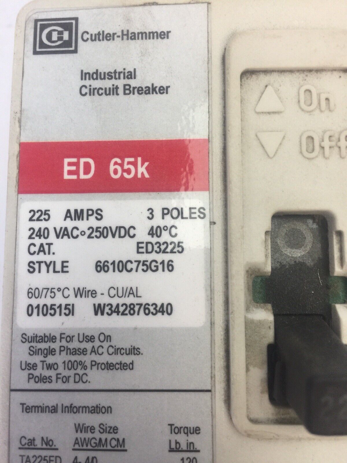 CUTLER HAMMER ED3225 INDUSTRIAL CIRCUIT BREAKER 225AMPS 240VAC 250VDC 3 POLES