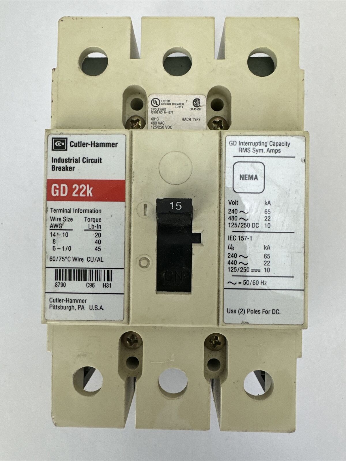 CUTLER HAMMER GD3015 CIRCUIT BREAKER 480VAC 250VDC 3P 15A GD 22K