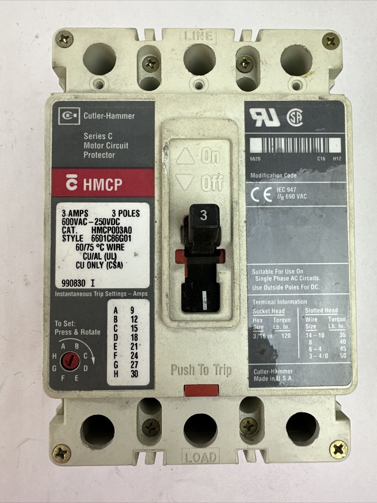 CUTLER HAMMER HMCP003A0 SER C 3POLE 3AMP 600VAC 250VDC 6601B86G01 MOTOR CIRCUIT PROTECTOR