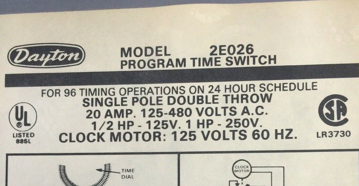 DAYTON 2E026 PROGRAM TIME SWITCH 125-480VAC 20AMP FOR 96 TIMING OPERATIONS ON