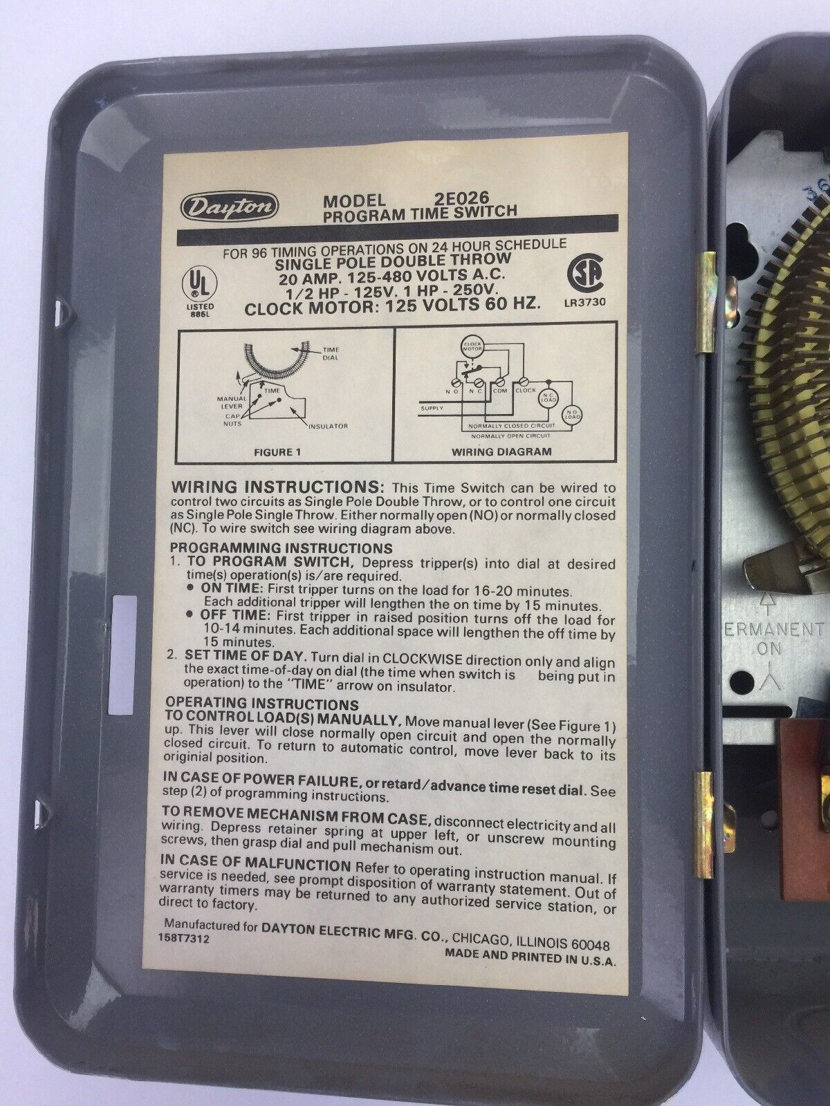 DAYTON 2E026 PROGRAM TIME SWITCH 125-480 VAC 20 AMP FOR 96 TIMING OPERATIONS ON 24 HOUR SCHEDULE