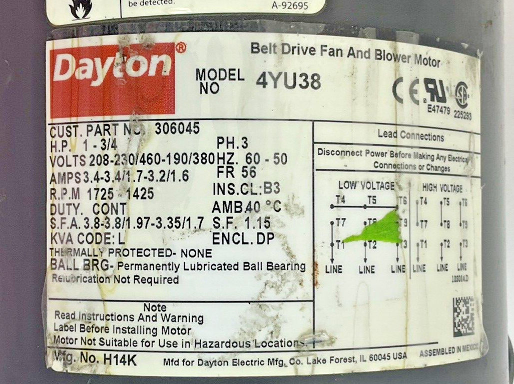 DAYTON 4YU38 BELT DRIVE FAN AND BLOWER MOTOR HP 1-3/4 3PH 60-50HZ