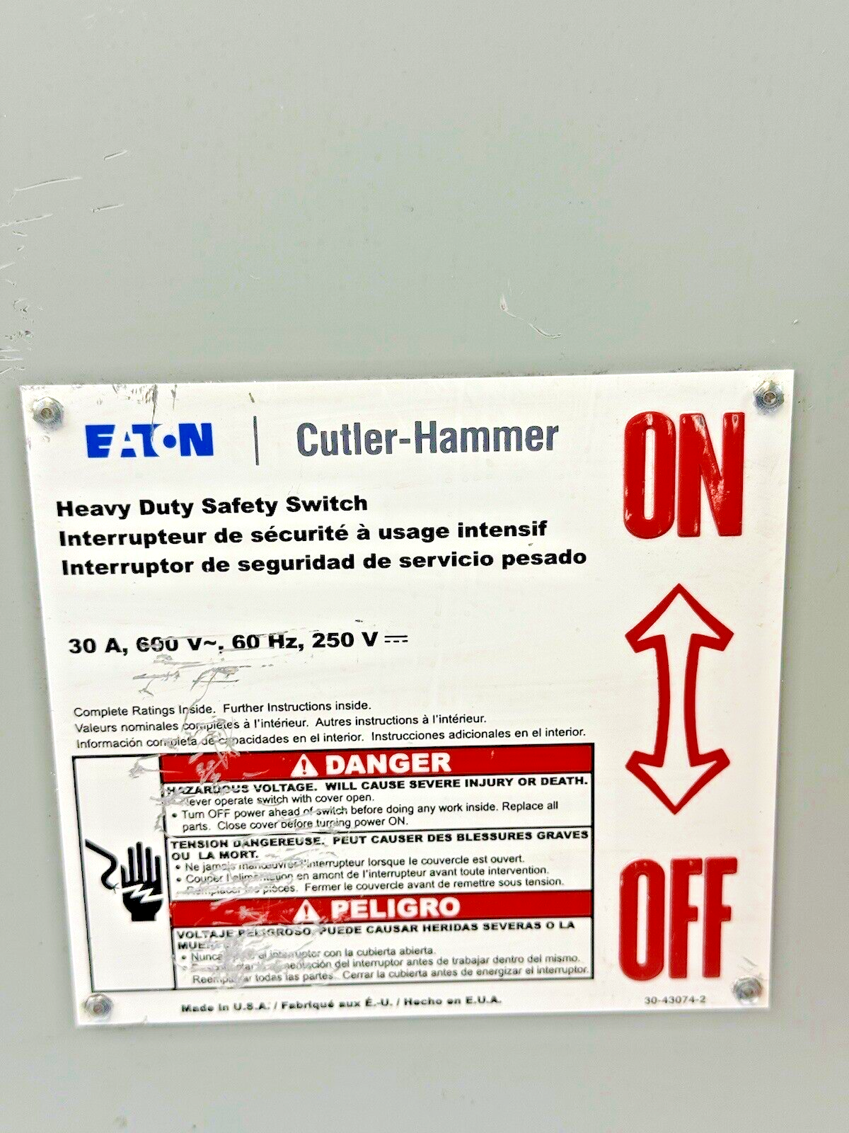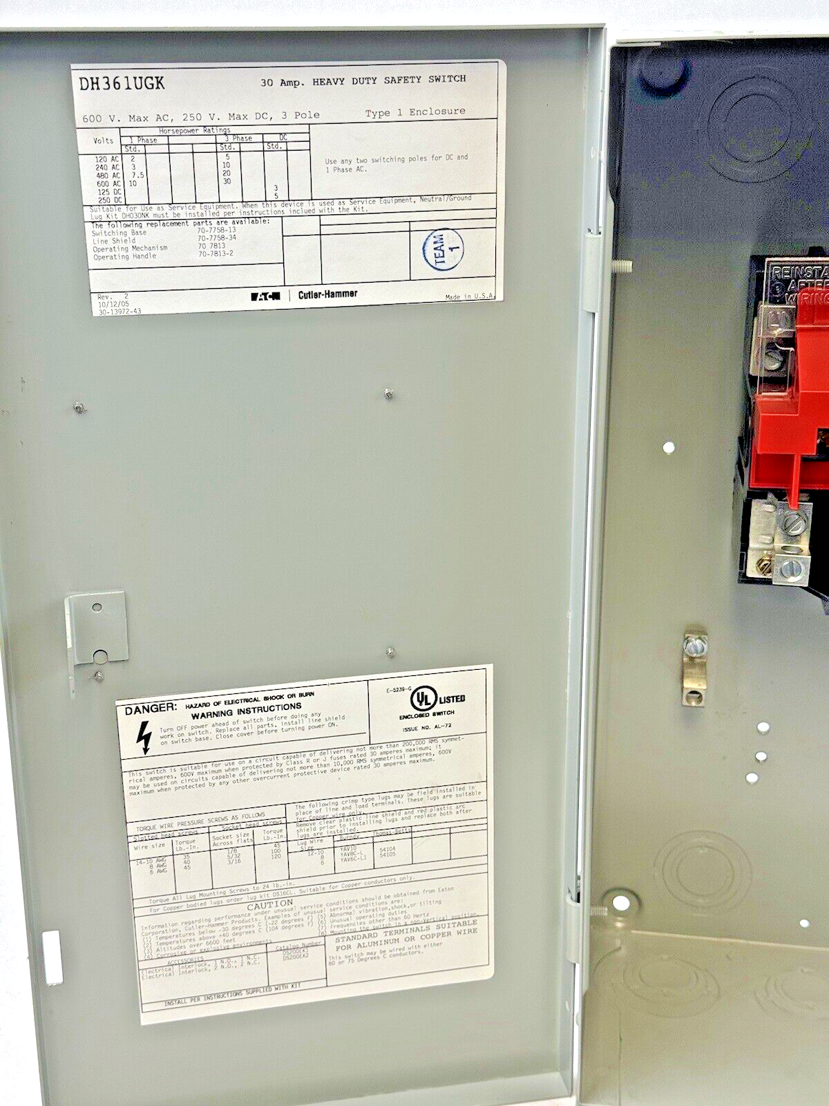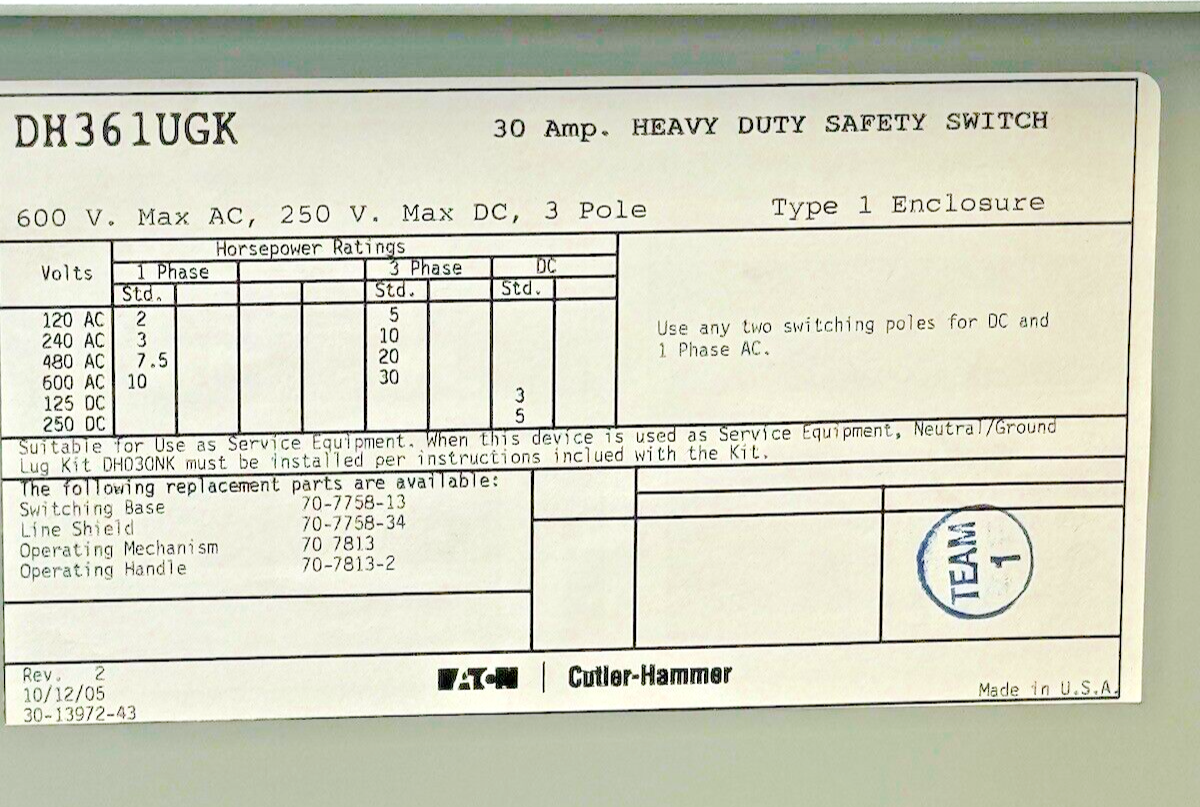 EATON / CH - DH361UGK - HD SAFETY SWITCH - 30A/ 600VAC/250DC / 3 POLE/ TYPE 1