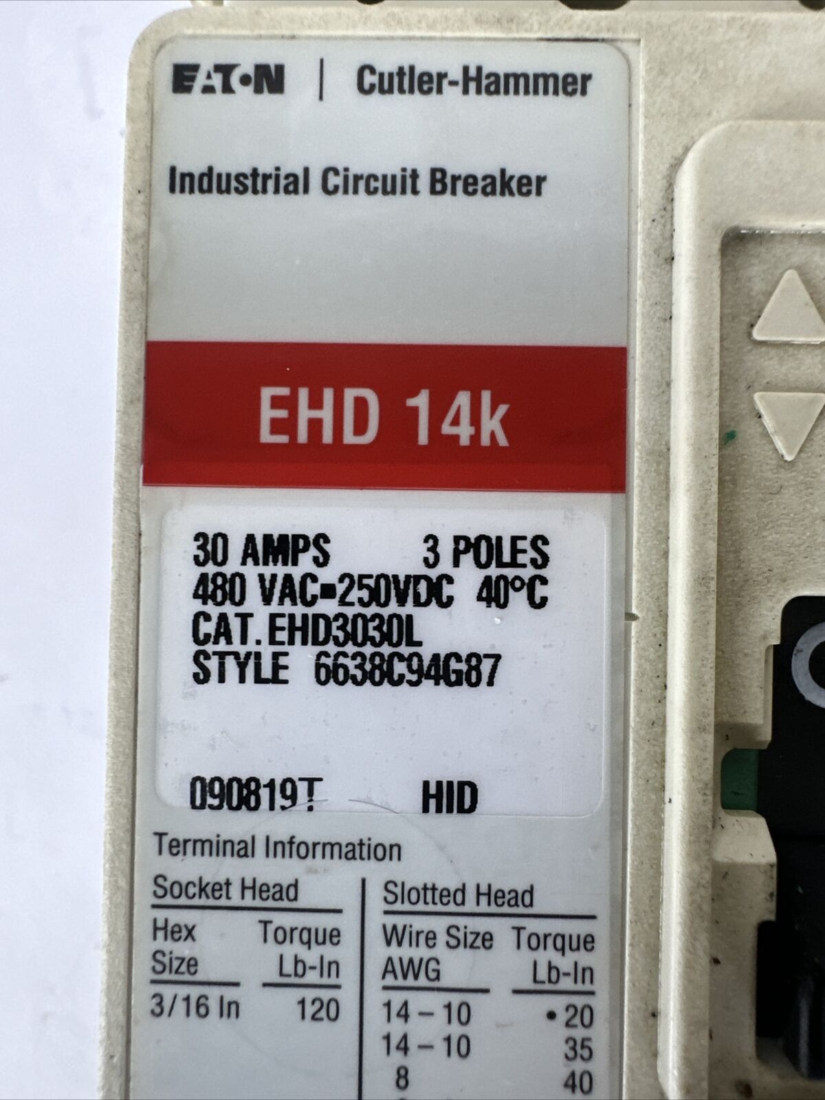 EATON CUTLER HAMMER EHD3030L 30AMP 3P 480VAC 250VDC 6638C94G87 CIRCUIT BREAKER
