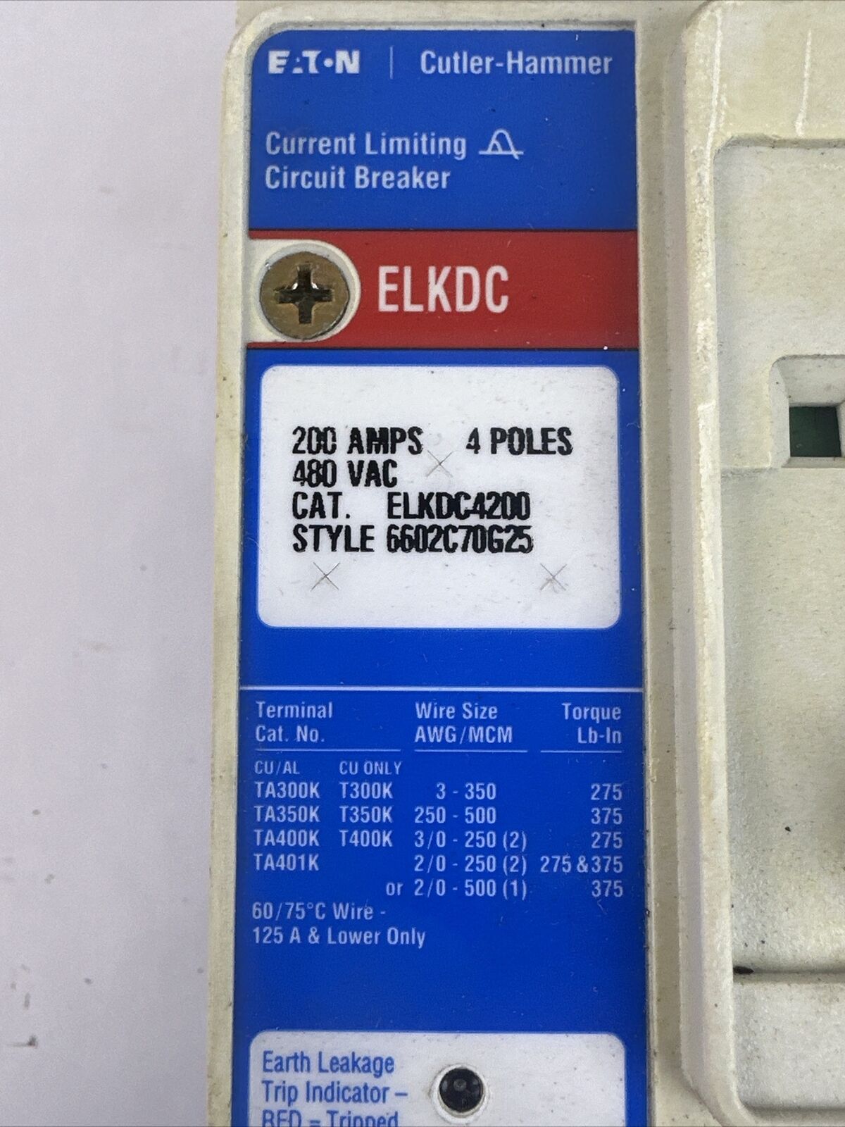 EATON CUTLER HAMMER SLKDC4200 CIRCUIT BREAKER 4POLE 200AMP 480VAC KT3200T ELD344