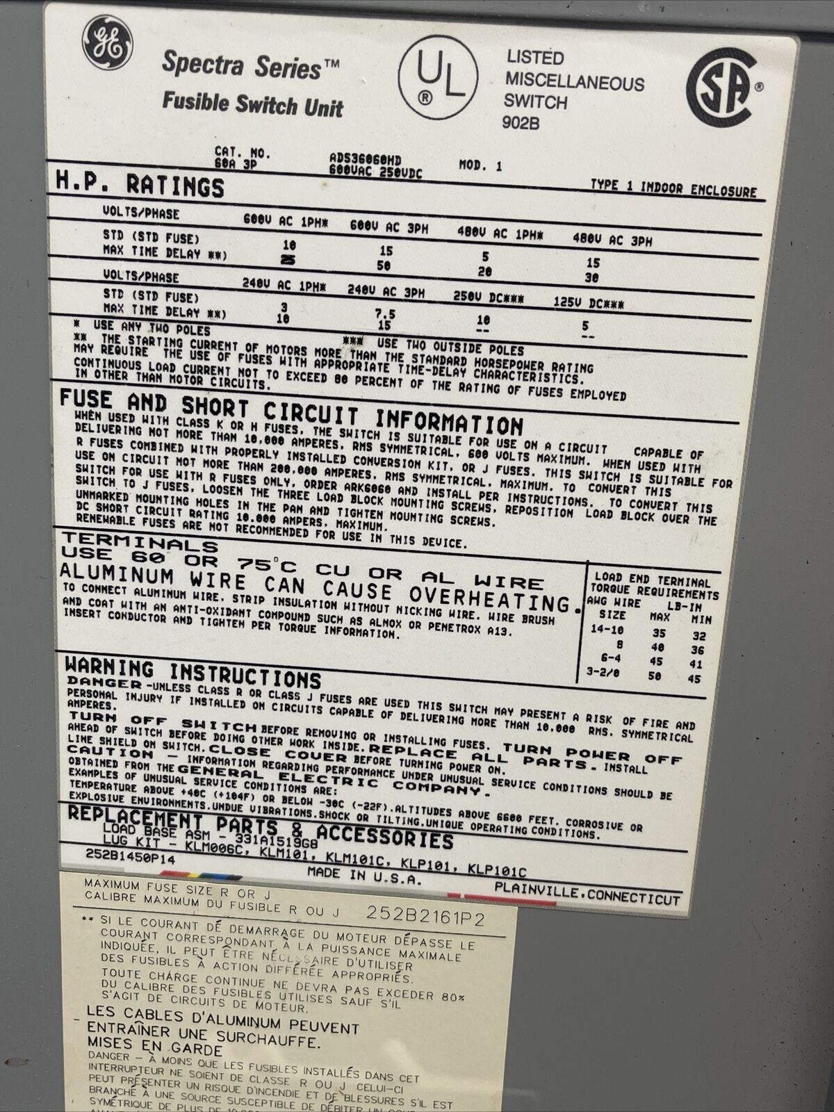 GE ADS36060HD FUSIBLE PANELBOARD SWITCH UNIT 60A 600V 50HP 3P SPECTRA SERIES