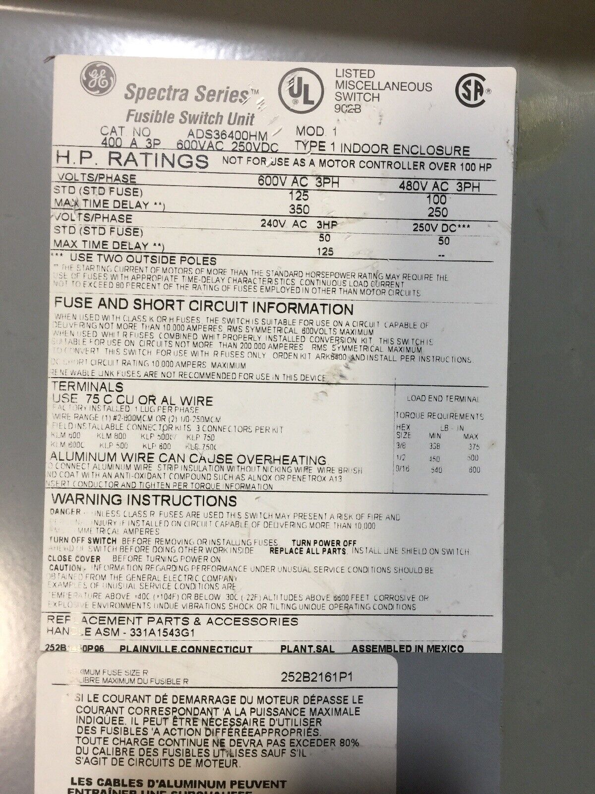 GE ADS36400HM FUSIBLE PANELBOARD SWITCH 600VAC 400AMP 350HP