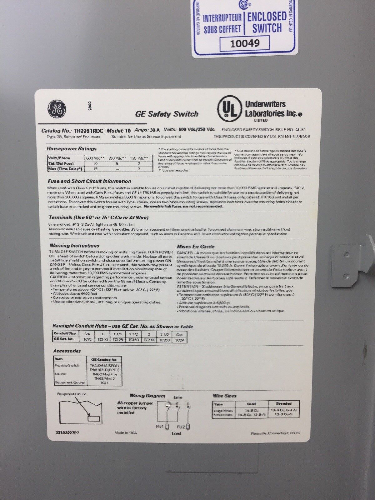 GE TH2261RDC HEAVY DUTY SAFETY SWITCH 2 POLE 2 WIRE 30 AMP VOLTS: 600VDC/250VDC