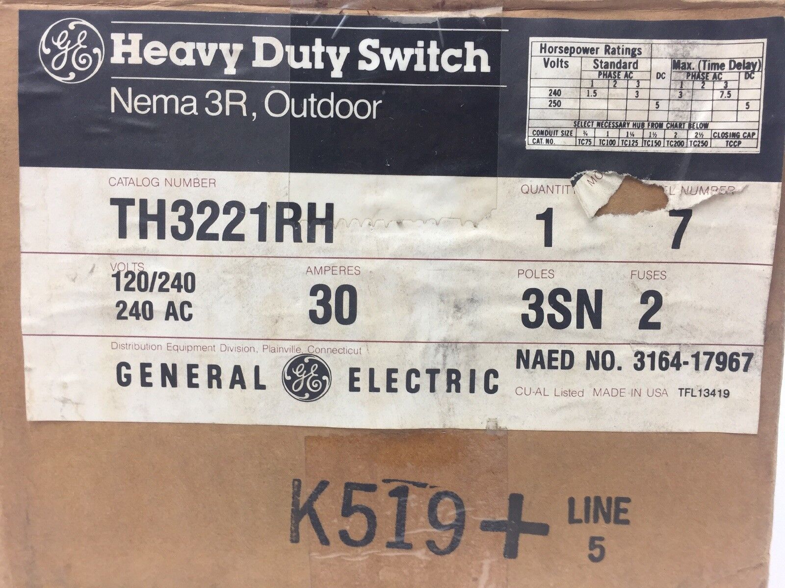 GE TH3221RH HEAVY DUTY SWITCH NEMA 3R OUTDOOR 120/240 VOLT 240 AC 30 AMP 3SN POL